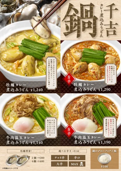 今年も【千吉鍋】は「牡蠣カレー煮込みうどん」と「牛肉温玉カレー煮込みうどん」をご用意しました。